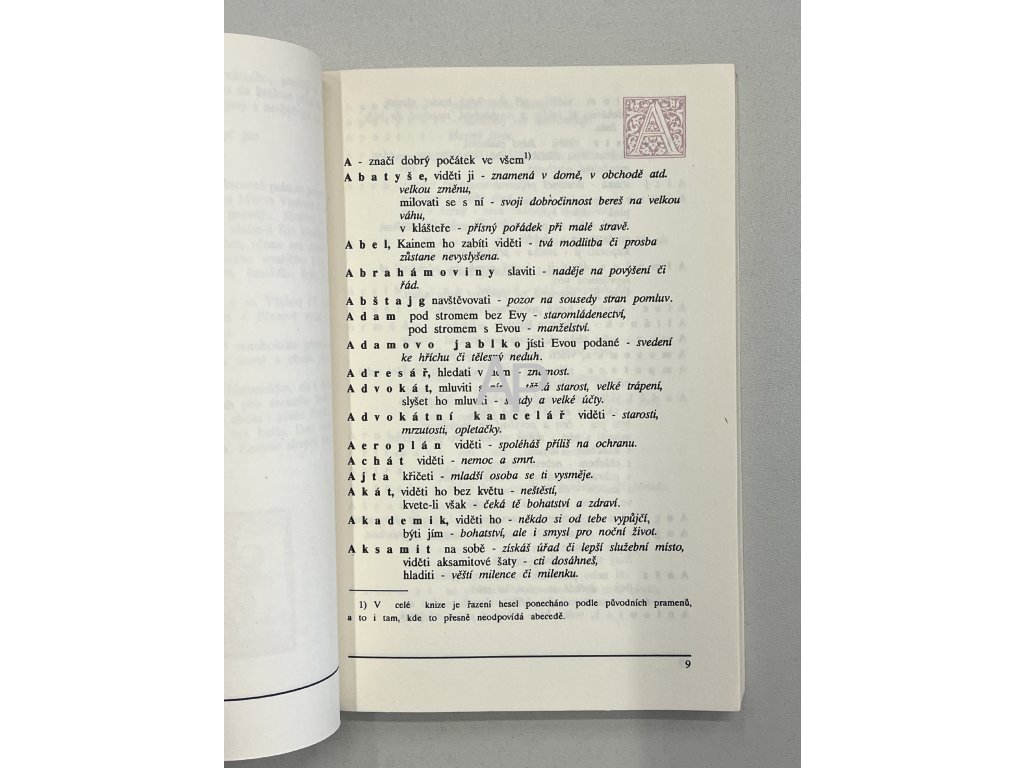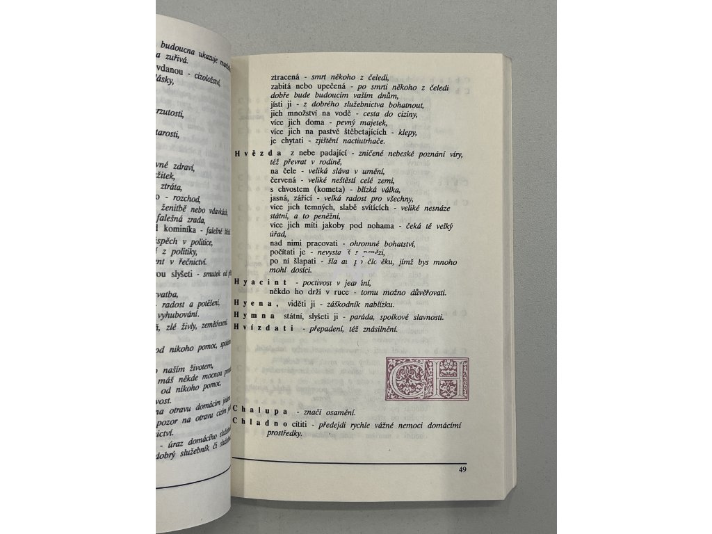 Vše o čem se vám zdá najdete v tomto snáři. Buďto si najdete slovní výklad nebo číslo do sporty či podobně. Také zde najdete - Čísla štěstí a charakteru: podle svého jména zjistíte své číslo. Povahu ženy podle měsíce narození-velmi kratičké shrnutí. Číslo štěstí: jak ho vypočítat dle datumu narození. Sny vykládané čísly: pod jednotlivými čísly se nacházejí hesla, která jim lety byla přiřknuta (1-90). Planetář: pomoc při určení vaší osobní planety a jejich charakteristiky. Ale i Horoskopy podle čínské astrologie.
