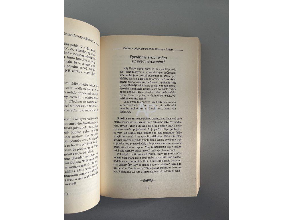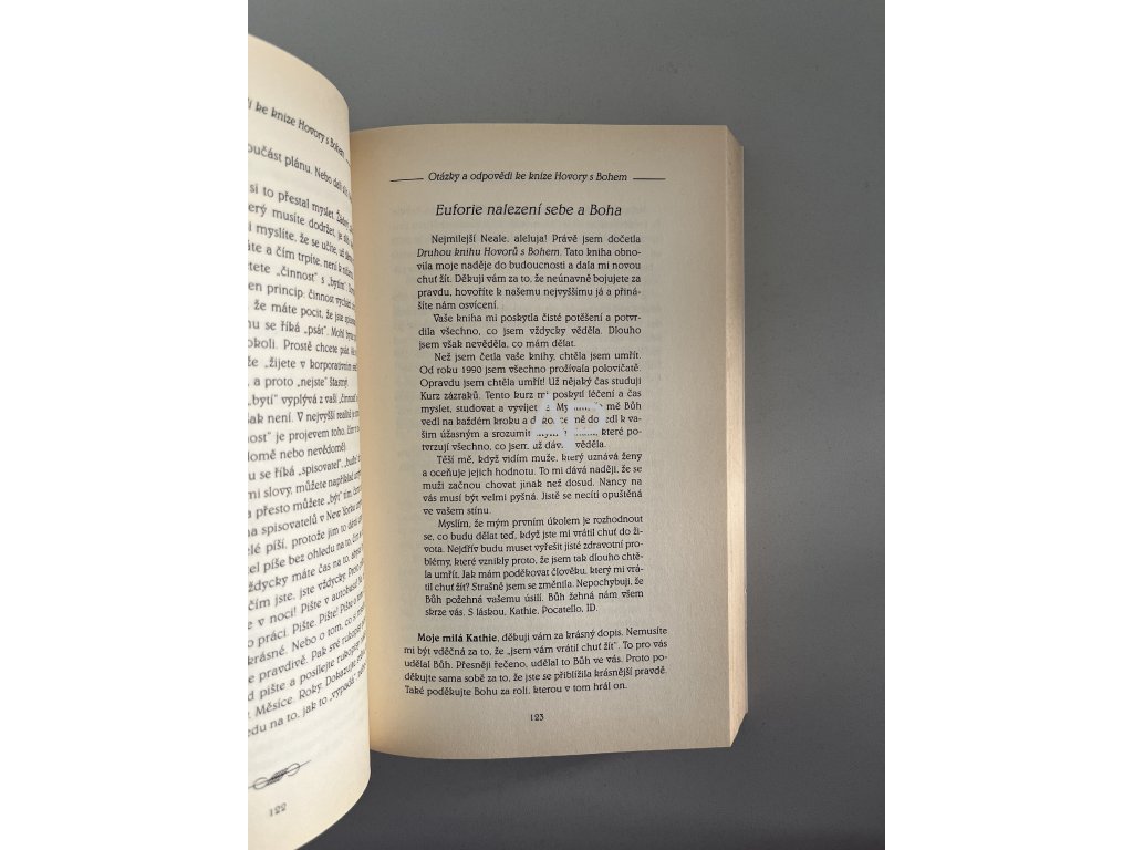 Miliony čtenářů milují Hovory s Bohem které byly přeloženy do šestadvaceti jazyků. Tisíce čtenářů posílají Nealu Walschovi své otázky - otázky, které se týkají náboženství, dobra a zla, tělesného a duševního zdraví, smrti, proroctví, povahy Boha a vesmíru, modlitby, andělů a ďáblů, duchovní cesty, partnerských vztahů a mnoha dalších problémů. V této knize Neale odpovídá se svým charakteristickým humorem a moudrostí na nejzajímavější a nejprovokativnější otázky; výsledkem je nesmírně inspirující kniha. Nealovy odpovědi ilustrují přímé spojení mezi duchovní a hmotnou realitou a ukazují, že to, čím jsme a co děláme, je výsledkem toho, jak myslíme a v co věříme. Tato kniha nám dává příležitost zamyslet se nad sebou, změnit se, a tím možná změnit svět.